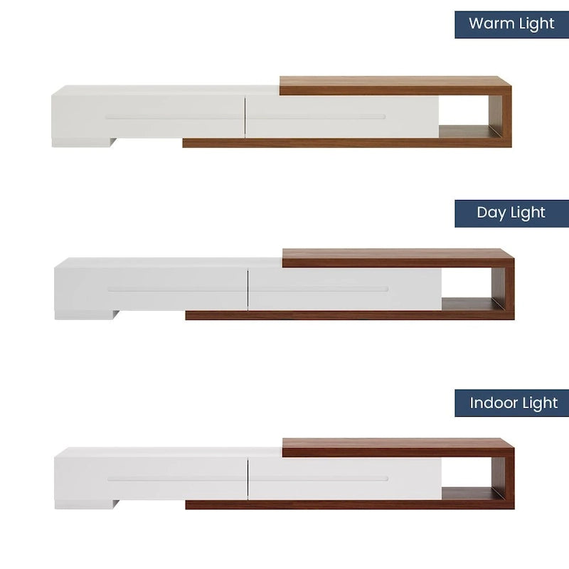 Modern Extendable White TV Stand, Solid Wood Media Console for Up to 100 Inch TV with 3 Drawers, Fully-Assembled, Walnut Veneer
